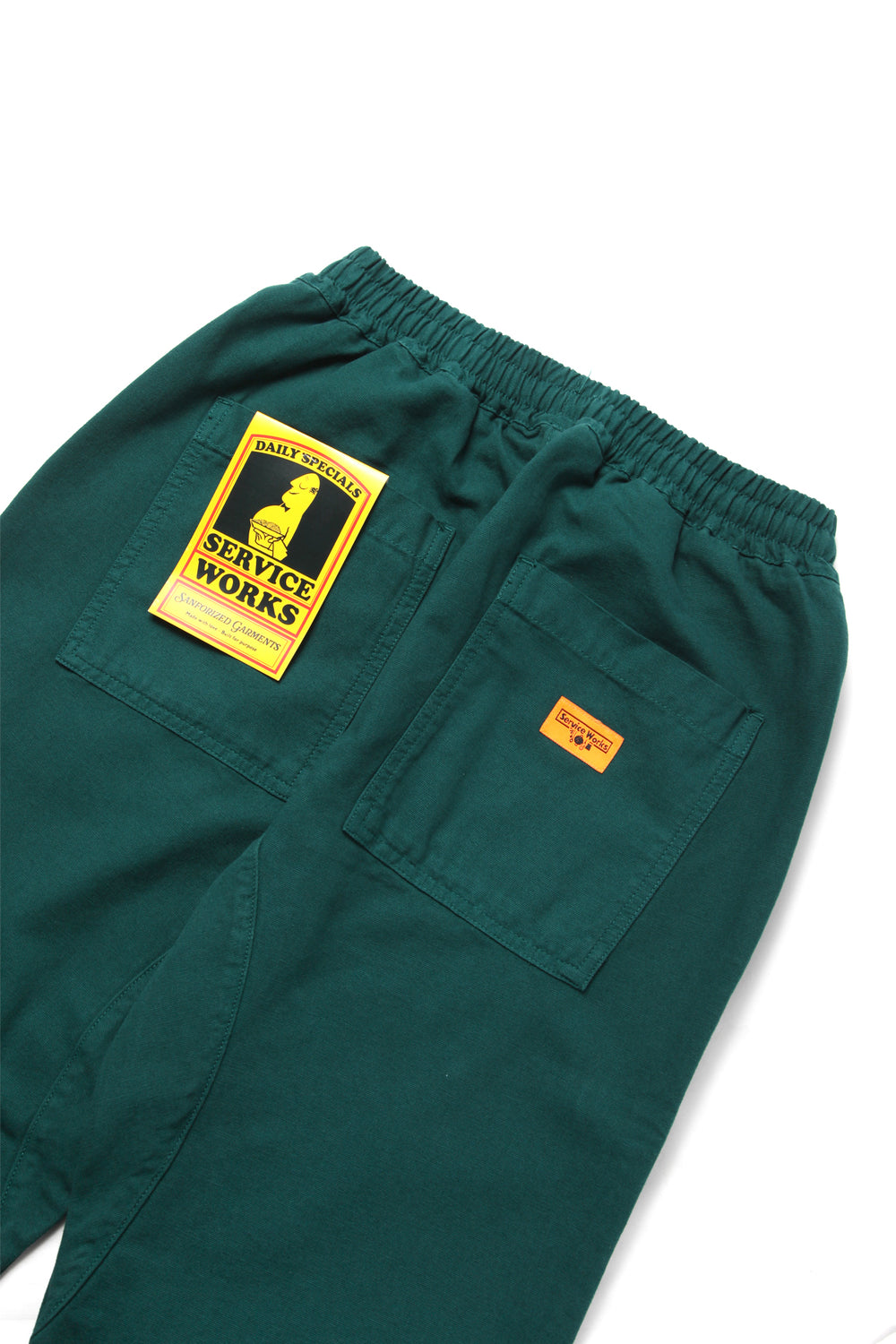 Classic Chef Trousers by Service Works, Classic straight fit leg, Organic GOTS 360gsm (11oz) cotton canvas, Adjustable waistband with drawstring, Fatigue front pockets, Rear pockets with woven label